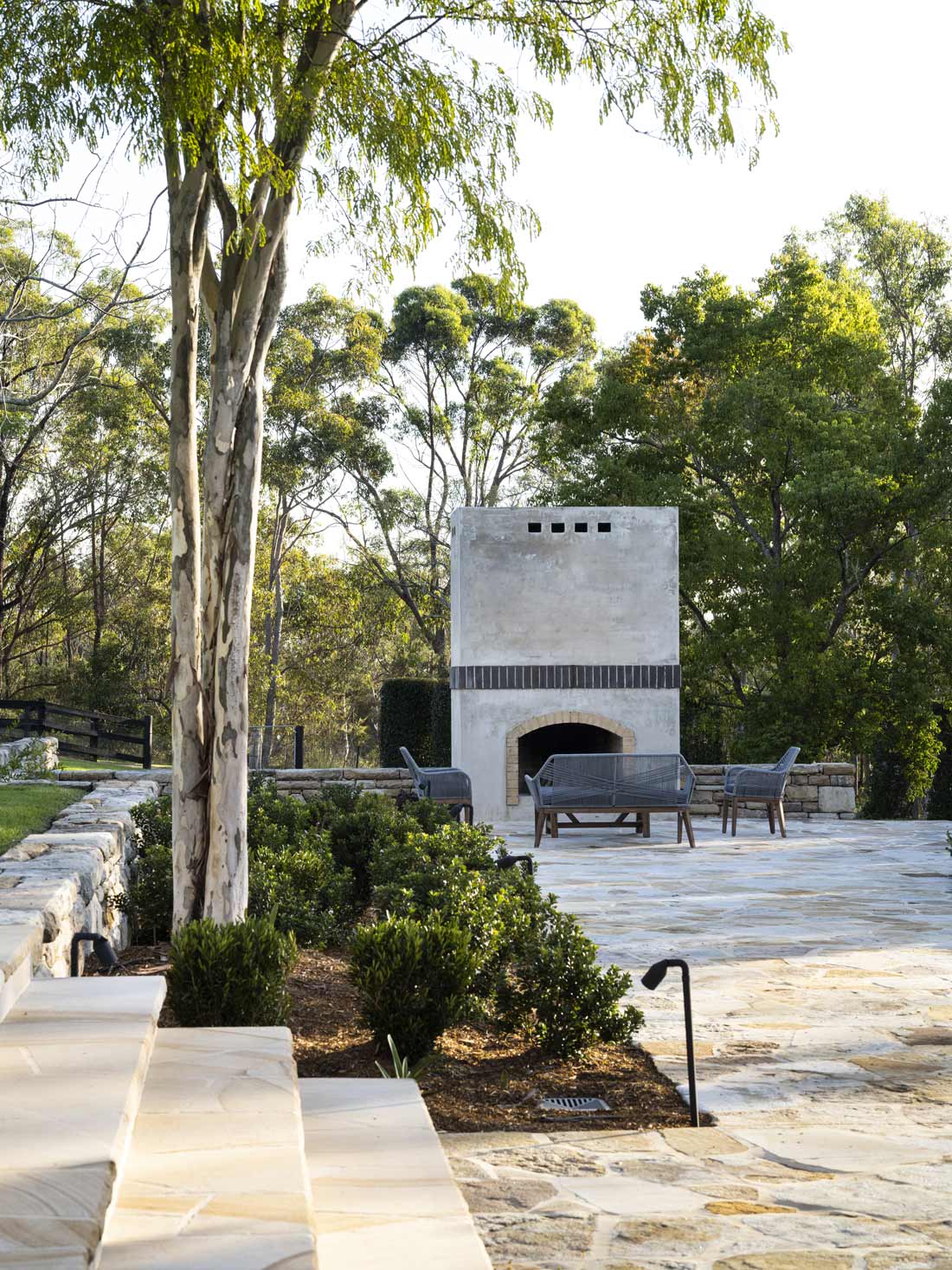 A lovely semi-rural property on the outskirts of Sydney with some beautiful established trees. Gardens were refreshed and united with new plantings coinciding with a swimming pool refurbishment. An outdoor fireplace creates a destination for relaxation. Constructed by KMD Outdoor Spaces